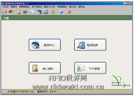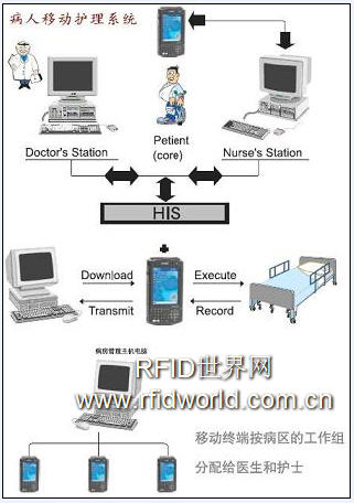 2.RFID移动护理:系统利用原有的HIS系统生成医嘱执行项目,护士使用PDA到患者的床旁,读取患者佩戴的RFID腕带,通过无线网络自动将需要执行的医嘱调用,护士通过PDA记录医嘱具体执行的信息,记录患者生命体征及相关项目,用药、治疗信息确认,实现动态实时的床边护理服务。