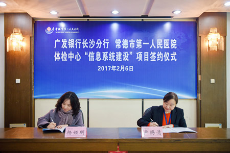 2月6日,广发银行长沙分行与常德市第一人民医院健康管理中心“信息系统建设”项目签约仪式在生活服务楼七楼会议室举行。医院总经济师卢赐清与广发银行长沙分行副行长杨娅明签署合作协议,标志着该院首次与股份制商业银行合作,共同推进健康管理中心信息化建设。