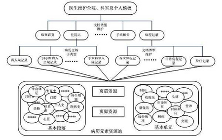 3.1 病历模板本系统首先是由医生制作出各种病历文档模板,然后在需要书写时,根据自身需求调取对应模板,在各段落中勾选或手动输入需要记载的内容。如图2 所示, 本系统按照树状层级结构来维护模板。首先病历模板通常由三部分组成,包括页眉页脚、段落及复合单元,同时又按照使用范围不同,分为全院通用模板、科室模板以及个人模板,每类模板相互独立,操作维护方法完全相同。本系统粗粒度的将诊疗活动中产生的文档分为八大类,包括住院志、病程记录等,其中除了病案首页是单独一种记录文件外,其他每类文档都包括多种子文档。如病程记录就包括首次病程记录、主治医生查房记录、出院病程记录等数十种子文档。
