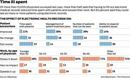 Medscape去年发布的一份行业刊物报告显示,1.5万余名受访医生中有57%表示,电子病历非常耗时,减少了他们面对面给患者看病的时间。加州大学旧金山分校(UCSF)医疗价值中心(CenterforHealthCareValue)主任、肺脏学家R·亚当斯·达德利(R.AdamsDudley)博士表示:“我们未到达应许之地。”