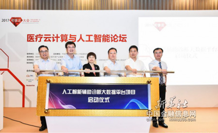与此同时,会上正式启动了“人工智能辅助诊断大数据平台”项目。“人工智能辅助诊断大数据平台”项目由国家卫生计生委医管中心与中国信息通信研究院联合吉林大学第一附属医院、浙江大学医学院第一附属医院、郑州大学第一附属医院等单位共同发起,旨在整合病理、影像、心电等医疗数据资源,搭建医疗人工智能辅助诊断测试训练平台,为产业提供算法训练、产品优化、标准验证、测试认证等公共支撑服务。国家卫生计生委医管中心主任孙阳、中国信息通信研究院院长刘多、国家卫生计生委医管中心处长赵靖、浙江大学第一附属医院院长王伟林、郑州大学第一附属医院党委书记赵杰、吉林大学第一医院副院长王海峰共同开启了项目启动按钮。