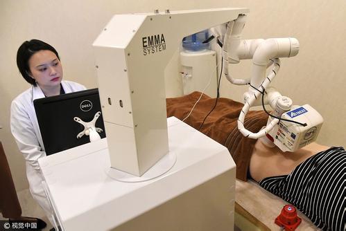 “机器人在工作前会测量人的身高和皮脂厚度,测算穴位的位置下针,测量精度能精确到0.34毫米。机械手上还会有超声传感器,避免扎得太深,同时控制扎的速度和提拉。”徐天成说。