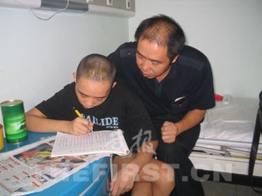 “北-京-奥-运”,在病房内安安正在边读边练习写汉字,他头部的刀口已基本愈合。