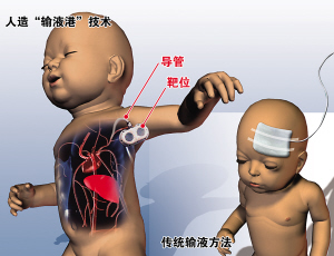 在临床治疗上,特别是化疗时,对患儿血管刺激很大。很多患儿血管因此坏死,皮肤组织出现溃烂等症状。“输液港”的应用,将有效避免外周静脉血管受损,能减少各种并发症的发生。