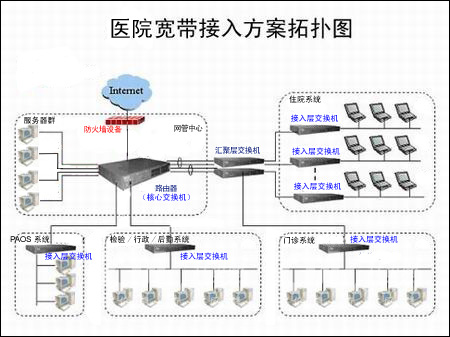 随着医院信息化的不断深入,医院OA系统、MIS系统、HIS系统、PACS等系统相互融合,现在医院网络信息系统的安全甚至比银行的要求更高,因为现在医生离不开电脑,可以说,一旦网络故障或者信息系统瘫痪的话,整个医院的运作就会大受影响。一旦一个信息系统出问题,包括服务器、网络数据库、应用系统这几块都会中断,而这基本上是不允许的。举例来说,一般早上10点到11点半,是医院就诊的高峰期间,医生开处方全部是在电脑上面,药房配药也在这个信息系统上;而且地方的医保是实时结算,病人的数据、费用信息在医院和医保局之间实时交换,就像信用卡取款一样。如果网络中断三分钟,医院的业务就要停三分钟,如果停一个小时的话,整个医院就会人满为患。下图是医院网络宽带接入拓扑图。
