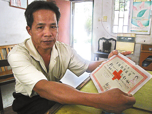 在都会村的老卫生站里,麦灶贺给记者看他的乡村医生证书。