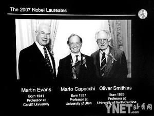 新华社电 昨日,瑞典卡罗林斯卡医学院宣布,将2007年诺贝尔生理学或医学奖授予(屏幕中从左至右)英国人马丁·埃文斯、美国人马里奥·卡佩基和奥利弗·史密斯,因为他们在改造活体内特定基因的“基因靶向”技术等方面做出奠基性贡献。