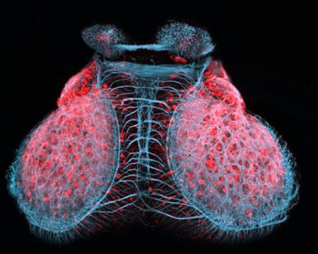 20倍显微镜下的斑马鱼胚胎中脑和间脑