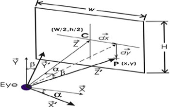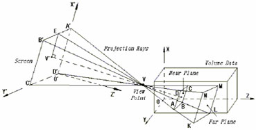 为了达到真实的成像效果,VE一般采用透视投影法。我们提出的成像算法可自动排除传统透视投影法中不必要的坐标变换,同时将坐标变换、表面检测、法向量计算等紧密结合起来,在一次光线跟踪过程中完成这些计算,从而提高了算法的效率。成像分以下几步完成:求屏幕所在的平面方程;求屏幕坐标系各坐标轴的方向;计算屏幕坐标系原点的位置;最后完成三维成像。成像算法原理图如图1所示。