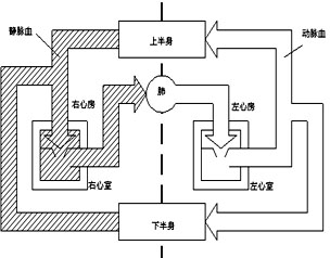 简化的循环系统,血液从右心室输送到肺部,动脉血由肺流出来先回到左心房,在由左心室射向全身。静脉血从全身各处流回回到右心房,下一次循环开始。