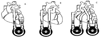 图形A,左心室辅助设备(LVAD),被收集到设备中的血液是来自左心室(LV)和被泵入主动脉的血液。图形B,右心室辅助设备 (RVAD),被收集到设备中的血液是来自,右心房(RA)和被泵入肺动脉(PA)的血液。图形C,双心室辅助设备 (BiVAD),它将左心室辅助设备(LVAD)和右心室辅助设备(LVAD)结合在一起的设备。