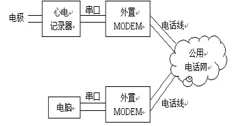 Modem心电数据通信系统由用户端心电记录模块和医院接收端的PC机模块组成,其中心电记录模块包括心电记录控制器和外置Modem,PC机模块包括用于存储并分析心电数据的PC机和外置Modem。两种DTE通过Modem接入公用电话网(PSTN)实现两者间的数据通信:用户端心电记录模块通过Modem主叫请求发送数据,PC机模块响应后,由心电记录模块按照约定的协议发送相应的数据,PC机模块通过Modem接收串行数据并自动存盘,系统框图如图1所示。