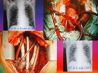 病人陈先生感染细菌性心内膜炎,造成心脏破坏(左下方),进行全心脏摘除术,并放置叶克膜(右上方)体外维生系统以维持生命。