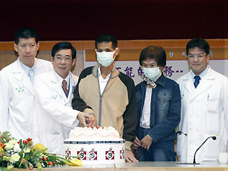病人陈先生(中)幸运出院,与医疗团队切蛋糕庆生。(图:东森新闻)