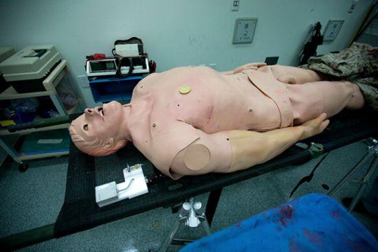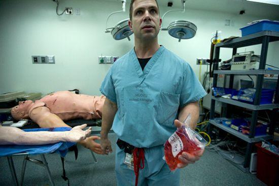 39岁的D·J·格林已经担任6年海军外科医生,在2004年第二波激战爆发之际,他正在伊拉克法鲁贾(Fallujah)附近工作。10天内他接到200名患者,这几乎让他变成一个外伤手术机器人。现在,他专门训练即将前往伊拉克和阿富汗的医生。高仿真模拟人可以通过编程,模仿一系列外伤情况,例如从枪炮伤到脖子及四肢外伤;脑伤、骨折和简易爆炸装置爆炸引起的呼吸道受损;或者医生无法拯救的患者的死亡场景,这经常是战区令人感到沮丧的事实。格林手中的仿真O型阴性血,将被当作教学道具。事实上这种人体模特无法进行液体循环,但是它左边的胳膊可以进行静脉注射,而且医生感觉就跟真的一样。
