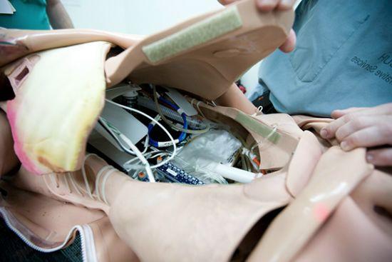 虽然你不会将美国METI公司生产的高仿真模拟人(HPS)误认为是真人,但是它的呼吸、排尿和眨眼动作确实非常逼真。高仿真模拟人利用的技术跟高仿真遥控人体模特一样,它能模拟一系列外伤和相应的症状。医生能感觉到它的脚上、手上、胳膊上、脖子上和腹股沟的脉搏;能将静脉注射针插入它的胳膊;能听到它的心搏和呼吸;能看到瞳孔扩大以及更多细节。