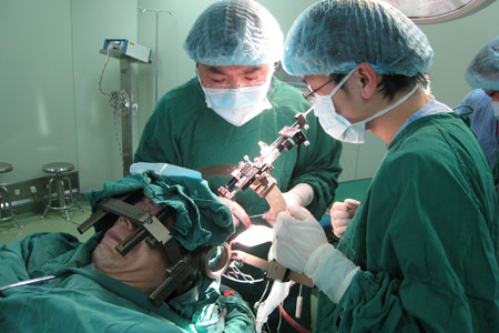在完成初步定位后,上午10时许,头戴坐标定位框的陈先生被推进手术室。“这是脑外科极为少见的、必须让患者在手术中保持清醒状态的开颅手术。”王伟副教授用特殊钻头在陈先生头骨上方两侧钻出两个一角钱硬币大小的孔,然后根据之前确定的大脑坐标,用微推进器将一根比头发丝还细的探针从头顶刺入脑组织达10公分的深度,到达丘脑部位,“手指头大小的丘脑上有30多个核团,其中只有一个核团是控制帕金森震颤的核团,我们的电极点必须精确地放在这个只有4毫米大的核团上,就像在一个巨大的足球场上穿刺一只奔跑的小白鼠。”