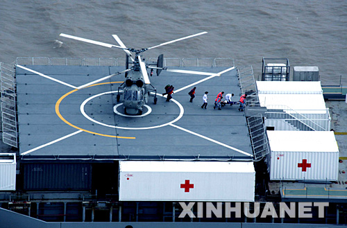 一架直升机将“伤员”运送到海上医疗船进行救治。海军新一代后勤装备保障在实战化条件下得到充分检验和运用。资料图片 新华社记者 查春明 摄