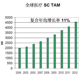 据市场调研机构Espicom预计,2010年全球医疗器材市场将突破2000亿美元,其中,医疗电子将占45%,达到900亿美元的规模。从中国市场来看,在经济加速发展、医院信息化进程加快及国家相关政策变化等几方面有利因素的影响下,2006年中国医疗电子市场(包括芯片和)规模继续加速增长,销售额突破200亿元,达到210.8亿元,同比增长15.6%,明显高于全球同类市场增长水平。未来几年,中国医疗电子市场年均复合增长率达18.2%,2011年中国医疗电子市场规模有望接近500亿元。