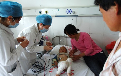 5月1日,阜阳市第二人民医院的医护人员在为一名患儿做检查。 记者当日下午从安徽省政府新闻办举行的新闻发布会上获悉,截至4月30日中午11时,安徽阜阳肠道病毒感染事件病例增至2477例。其中,已痊愈738例,死亡20例,仍在住院治疗和观察的702例(含36例重症病人),门诊轻型病人1017例。 新华社记者 李健 摄