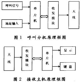 系统分为呼叫分机和接收主机。分机用来进行呼叫,编码使用单片机完成,分机的核心电路即是单片机与射频芯片的连接电路。主机负责接收分机发来的信号,并进行解码、显示和报警,主机上设有键盘用于翻查和删除。