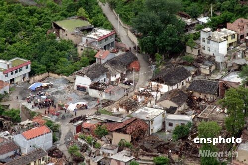 5月14日,空中拍摄的汶川县城一角。成都军区某陆航团四架直升机满载帐篷、矿泉水等灾区急需物资抵达四川大地震震中汶川县,并在返回时将第一批40名重伤员随机送抵成都的医院救治。 (中新社 张雷 摄)
