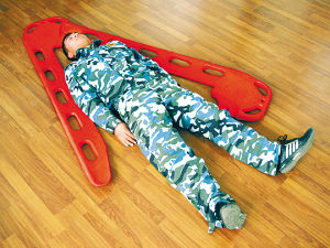 在王所长示意下,记者仰面躺下,只见他轻轻抠动担架上的一个锁扣,担架立刻呈现出“V”字形状,在身体两侧轻轻一合,整个人立刻被牢牢托举起来,脊椎、关节等被担架上凹凸的槽道牢牢固定。据悉,这个看似普通的担架涉及人体工程学、仿生学等多学科,就连它的材质也是由高分子材料制作的,具有易洗消,可水上漂浮等多种特点。地震中建筑物倒塌时,人员椎骨骨折是多发症,如果搬运伤员时方式不当,极易造成脊椎损伤,以致截瘫。唐山大地震时,相当一部分截瘫由此引起。“铲式担架、真空担架等一批新型急救担架可以有效避免这些问题。”王政所长充满信心地说。