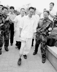 在汶川大地震中右脚截肢的李科,经解放军452医院和解放军总医院医护人员的精心救治,恢复很快,并安装了假肢。今天,李科已经能独自站立起来并行走了。