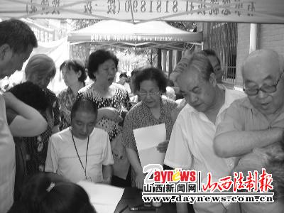 7月8日上午,记者来到太原市杏花岭区桃园北路东社区,现场一面是市民政局社区管理处的工作人员与排队等候的老年人逐一签订《太原市社区虚拟养老院试点服务协议书》,一面是身着太原市虚拟养老院服务队统一服装的加盟商为老年人提供各类服务。社区大院被围得水泄不通,不到1个小时功夫,工作人员就签订了89份协议书,更多的老人还在焦急等待。