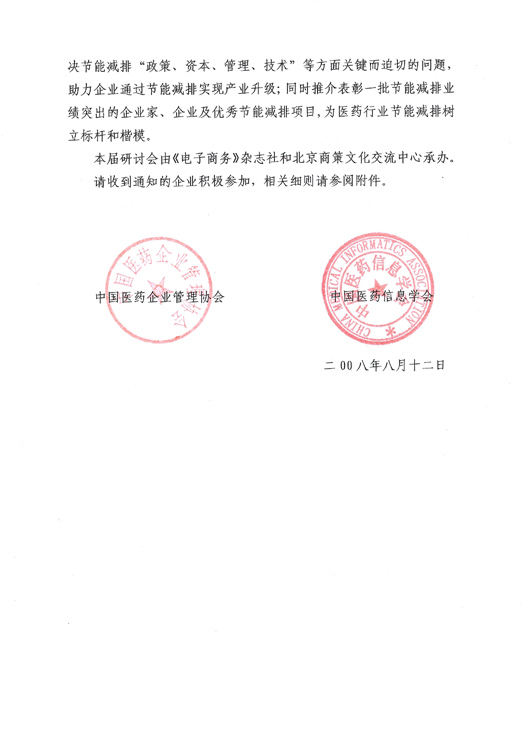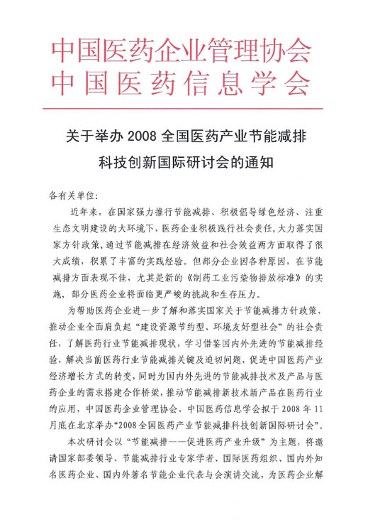 关于举办2008全国医药产业节能减排科技创新国际研讨会的通知