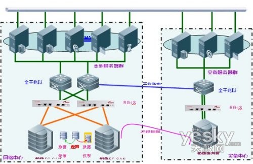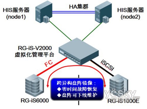 为了保证平度市人民医院HIS数据高安全性和高可用性(前端业务不间断运行),及不久的未来实现远程容灾,经过综合考察了多家软硬件产品提供商后,平度市人民医院最终决定使用锐捷网络的高可用性的存储容灾方案作为最终方案。方案采用锐捷网络的存储虚拟化引擎RG-iS-V2000实现基于网络层的容灾功能——跨盘阵镜像、快照、复制(同步/异步),存储磁盘阵列采用一台RG-iS6000光纤阵列和一台RG-iS1000E iSCSI阵列,数据互为镜像,无主从之分,数据会经过虚拟化引擎同时在两台阵列上各写一份,保证数据绝对安全。HIS服务器再通过双机集群做到应用系统的高可用,形成了第一道保险,正真实现了业务系统的永不间断。