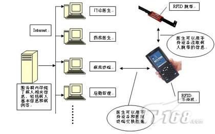 从上图可以看出,医院服务器上存储着病人最终完整的病例,每个病区医生的RFID手持机上也可以存储所负责病人的相关病例,通过手持机可以准确读出病人腕带上的相关信息,并且也可以写入相应信息,例如:病人是否对某种药物过敏,今天是否已经打过针,今天是否已经吃过药等等监控信息,大大提高了医院管理病人的效率,RFID技术可以完全代替现有病床前的病人信息卡。