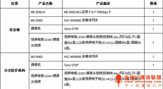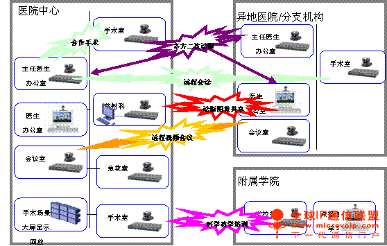 首先根据节点接入规模在核心选用一台MCUME5000,统一管理及调度全网视讯业务,在手术室配备H3C的远程医疗终端MG6060,在会议室或诊疗室配备H3C的MG6050等产品,实现各个医疗机构之间的远程诊断或远程专家会诊。