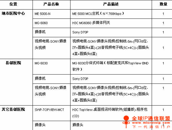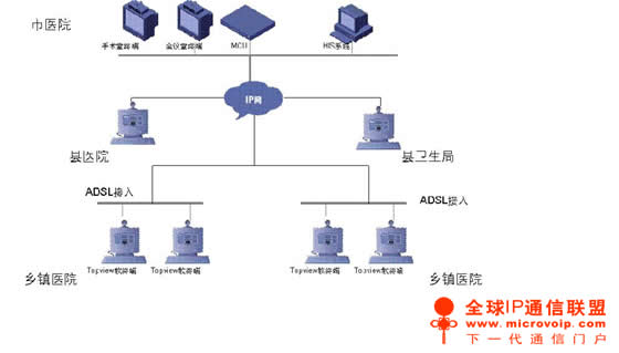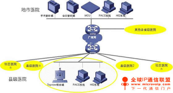 考虑到区县级医院的医疗水平和经费问题,首先根据节点接入规模在核心选用一台MCUME5000,统一管理及调度全网视讯业务,在各地市医院配置H3C的远程医疗终端设备MG6050或MG6030等产品。而在区县医院只配置一台PC加摄像头,利用H3CTopview软件终端,来实现远程诊断或远程专家会诊。