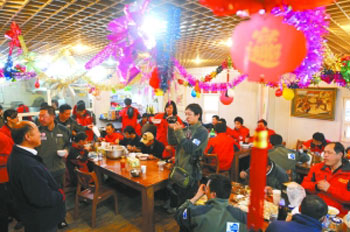 吃得高兴的老外纷纷向中国同行们拜年,生硬的中国话“中国新年好”,在食堂里此起彼伏。