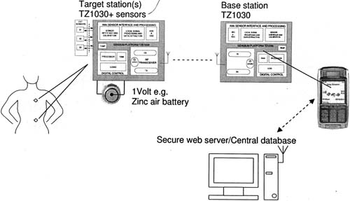 在这类应用中,系统结构(图4)可分为三个单元:传感器节点目标站、基站和因特网服务/中心数据库。目标站支持多种数据速率高达50kbps的传感器,用30mAhr电池可工作一年。传感器产生的极低电平信号可用片上程序和数据内存进行预处理。基站最多可链接8个目标站,每个监测一个人体的生理参数,诸如温度、心速、呼吸、血压等。数据进一步得到过滤和处理,然后通过无线或因特网传送至中心数据库,为保健或医疗提供依据。