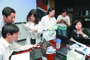昨日凌晨2时许,朝阳疾控中心会议室内工作人员正在分析接触者的资料。本报记者 李强 摄