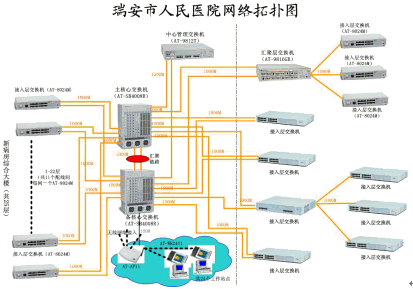 由于瑞安市人民医院网络的规模很大,普通的平面网络结构设计模型难以满足园区网络设计的需求。层次性网络设计模型,由于其良好的伸缩能力、易于实现、易于排除故障、可预测性、协议支持、易于管理等特点,可充分满足园区网络的长期需求。因此,安奈特在设计瑞安市人民医院网络的时候,采用了经典的“三层层次模型”和二层设计相结合的设计方法。设计中在瑞安市人民医院网络的核心层一级骨干的主交换机采用安奈特的AT-SB4008R电信级骨干路由交换机,这台主交换机是采用全冗余无单点故障的千兆路由交换机,在主核心层交换机上配置2块Switch Controller,(辅核心层交换机上配置一块)和4块八端口的光纤模块,用来为各楼层交换机提供千兆骨干光纤接口以及及核心交换机间的均衡链路。主核心交换机向下分别以千兆连接采用安奈特AT-9812T千兆多层交换机、AT-9816GB千兆多层交换机作为汇聚层交换机;采用安奈特AT-8024M网管可堆叠快速以太网交换机作为接入层交换机。另一台AT-SB4008R作为主核心交换机的备份,以同样千兆连接方式与其他交换机互联,同时连接安奈特AT-AP11 802.11b无线访问接入点,该无线接入点向下无线连接采用安奈特AT-WR2411无线网卡的24个工作站。