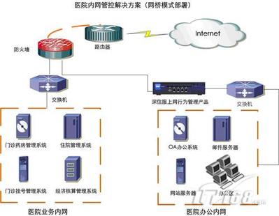 目前,我国大部分医院网络系统分为两个部分——用于日常医疗信息交换的业务网以及实时获取Internet信息资源的办公网。业务网上主要运行HIS(医院信息系统),包括门诊挂号管理、划价收费管理、门诊药房管理、药库管理、住院管理、手术室管理、院长查询和决策分析、多媒体触摸查询、经济核算管理等,一般医院的医疗,而办公网主要由职能部门使用,用于大家访问互联网、OA办公系统、Email等。