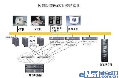 基于以上考虑,戴尔建议岳阳医院采用先进的分级存储方式,来构建整个PACS系统。具体而言,戴尔建议岳阳医院共采用在线存储和近线存储两种存储方式。一级在线存储存放医院的关键数据,采用FC SAN的存储架构,利用光纤通道对外提供服务;二级近线存储则存放医院一般应用系统的数据和不常用数据,如PACS系统的存档影像资料等。这个级别的存储采用基于内容寻址存储(CAS)的产品,使用高容量的SATA硬盘,利用专用的API接口对外提供服务。