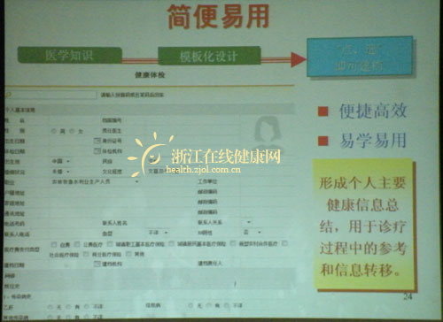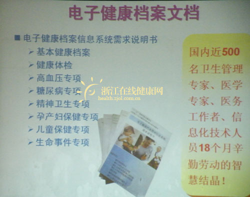 浙江在线健康网6月15日消息(通讯员俞欣 记者冯静)一个综合性、全方位的“个人电子健康档案系统”将在浙江省多个示范县(市、区)率先免费使用,使广大居民优先享受到信息化带来的优质医疗卫生服务的便利,只要一台能上网的电脑,医生就可以及时全面地获得患者的过往健康资料,减少了重复检查和不合理用药给患者带来的费用支出。