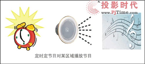 a.可通过系统控制软件和广播主机TM-8010对任意分区定时播送背景音乐节目,各区同时播放一种音乐节目或同时播放不同节目。可实现同步广播,分区广播,分区寻呼,定点定时播放指定节目。