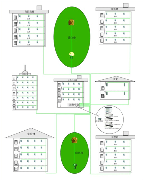 每栋楼的一个楼层作为一个消防分区。当本楼层有消防信号时,自动触发广播系统发产生报警声音,传递到本楼层。可预先在系统上设置报警。当本层有报警时与其相邻的上下两层也一起报警,更安全的预警。