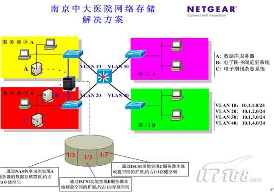【IT168 资讯】东南大学附属中大医院始建于1935年,其前身为中央大学(现东南大学前身)医学院附设医院,是集医疗、教学、科研为一体的大型综合性教学医院,是教育部直属重点大学附属医院,江苏省首批通过卫生部评审的综合性三级甲等医院。中大医院信息中心由于常年进行大量的数据存储备份,如今硬盘的空间已经接近耗尽,他们就在急需寻找存储解决方案的时候,知道了NETGEAR网络存储产品,并被其强大的功能和简单实用的解决方案所吸引,选择了NETGEAR READYNAS NVX系列产品。 用户需求 通过和中大医院信息中心进行交流沟通,了解到医院已有专为后台服务器群提供服务的高端存储。信息中心作为本次使用的部门,正寻求一台部门级存储,实现三个方面的应用: 1.中大医院电子图书阅览系统的数据存储问题 首先,数据量在不断的增大,现在数据量已经到达200G以上,服务器的硬盘空间已经接近饱和; 其次,电子图书阅览系统,在我们进行测试之后,确认其无法兼容NAS存储功能,即无法通过共享文件夹的方式访问数据; 2.中大医院电子期刊杂志阅览系统的数据存储问题(问题基本与上面的应用类似) 3.中大医院数据库系统的备份问题 中大医院数据库系统是一台独立的服务器,且与上面提到的电子图书系统、电子期刊杂志系统不在同一网段,因此简单的网络存储设备在实现上必然会造成其中某台服务器在存取数据时需要进行跨网段操作,这样必然会导致读写速度的下降,因此必须解决跨网段访问的问题。 南京融科信息技术有限公司在详细的分析了南京中大医院的项目需求后,推荐了NETGEAR的ReadyNAS NVX高端基于IPSAN存储产品,并为用户设计了一套成本经济、简单实用、安全和完整的网络数据迁移和备份的ReadyNAS存储方案,并于2009年9月成功采购了此存储设备。