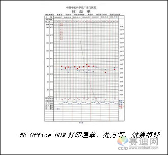 在高清晰的黑白文本模式下,其输出速度为每分钟27页,且使用上进纸前出纸的方式降低了卡纸几率,确保清晰、高效地完成处方、化验报告等不同尺寸和介质的文档打印工作。以打印体温单为例,爱普生ME Office 80W可以轻松打印A4和A5尺寸的文档,且在高清晰文本模式下,彩色打印速度可达到19页/分钟,相当于激光彩色打印速度的2.4倍,全面提升了打印工作效率。这款产品使用的是爱普生独有的全色颜料墨水,在普通纸上可实现印刷级的医疗影像文件打印,可耐光120年、抗臭氧100年,充分满足了医院档案和病例长久保存的需求。