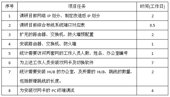 从上表可以看出最耗时耗力的任务是到每个办公室安装理清堆积了8年的各种设备缆线、跳线、安装HUB、增加跳线、安装双网卡、安装切换软件、系统切换调试,同时要确保调试时当事人在场。为达到这个目的与甲方负责人的配合相当关键,充足估计、事先通知。