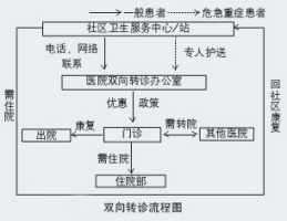 双向转诊从社区卫生服务中心/站开始。对于一般患者,社区通过电话、网络与医院双向转诊办公室联系后由患者自行前往即可,部分需住院患者可经社区直接联系医院住院部。而对于危急重症患者,社区需派专人护送。