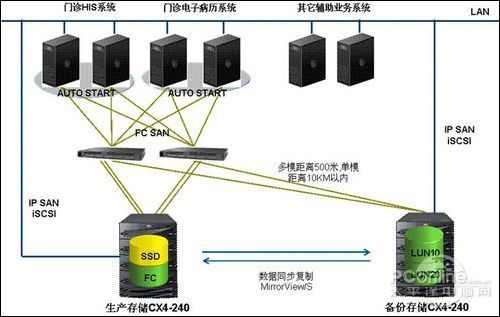 为防患未然,两套业务系统采用EMCMirrorView/S同步复制软件实现两台磁盘阵列间的基于数据卷级的镜像同步复制,从而做到对关键系统零数据丢失的最高级别保护。MirrorView是基于存储阵列之间的数据LUN级同步复制,不占用主机资源,可实现医院业务系统的数据容灾要求。