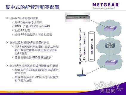5) 兼容未来的智能无线控制器管理协议, NETGEAR无线控制器和AP间采用业界标准的CAPWAP协议进行通讯,具备良好的设备兼容特性。CAPWAP协议可以实现无线网络设备的集中管理和自动配置。实现无线网络设备自动配置功能。