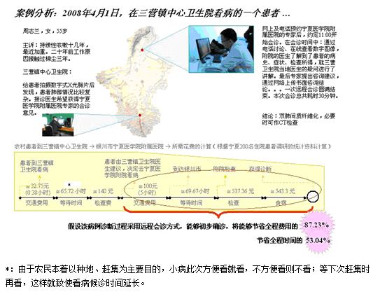 上述案例中,三营镇中心卫生院与宁夏医学院附属医院之间的会诊,比较传统转诊方法,全程费用节省87.23%,全程时间节省53.04%。